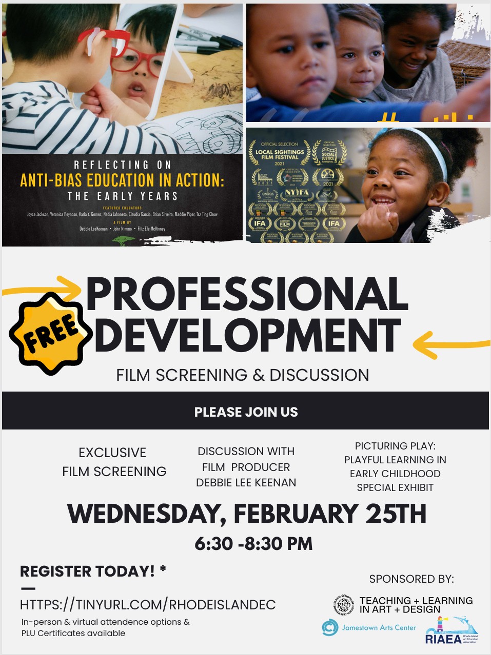 RISD’s Department of Teaching + Learning in Art + Design (TLAD) along with the Jamestown Arts Center & Rhode Island Art Education Association invites you to join Producer Debbie LeeKeenan for a live screening and discussion of her award winning film, Reflecting on Anti-bias Education in Action: The Early Years. This film, organized around the 4 goals of anti-bias education (identity, diversity, justice and action), features vignettes of early childhood classrooms interspersed with teachers reflecting on their practice on how to create more inclusive, just, and responsive communities across the curriculum.